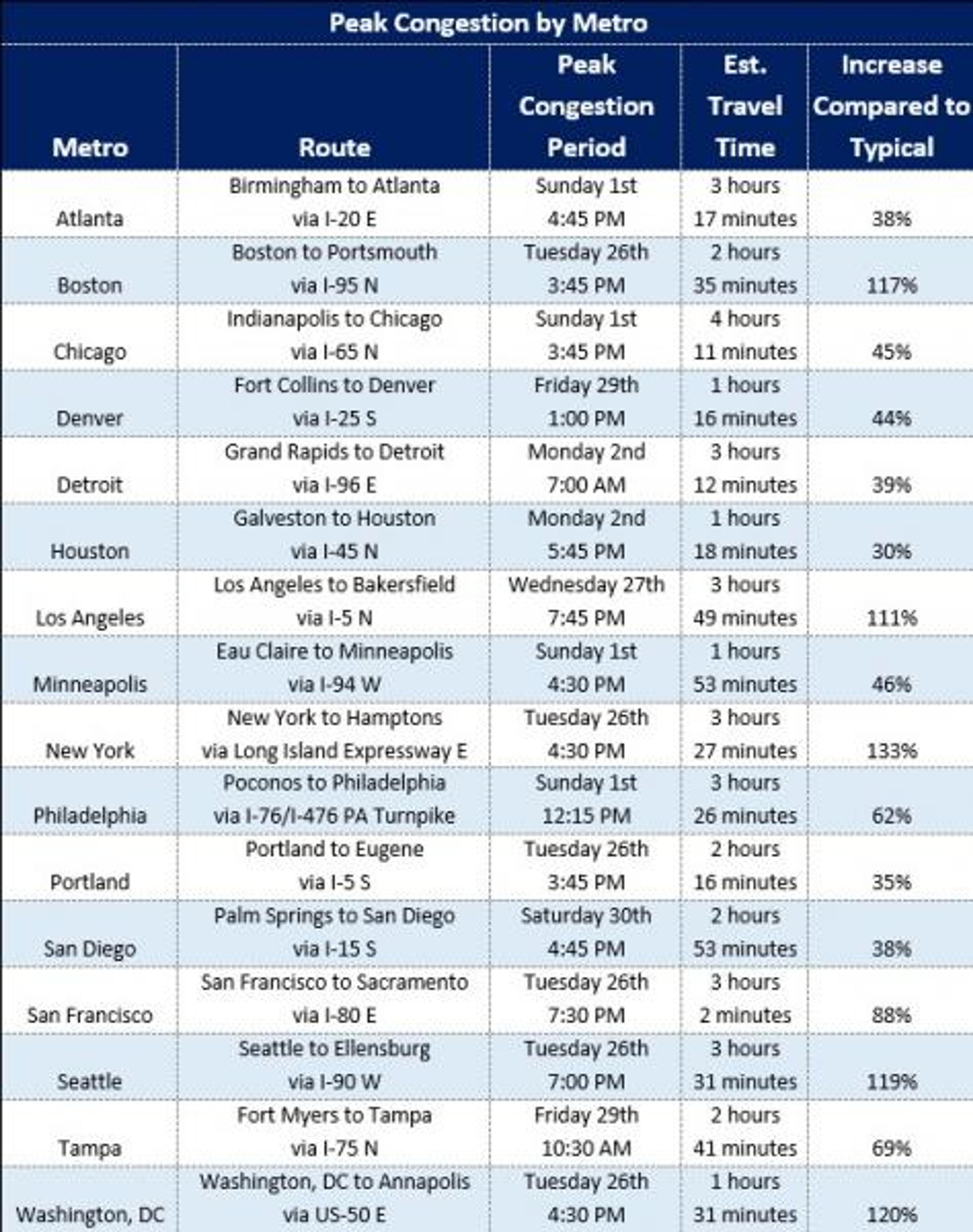 “With a record number of travelers expected to be on the road, drivers should follow traffic apps and local news alerts to avoid major delays,” said Bob Pishue, transportation analyst at INRIX. “This is especially important for drivers in metropolitan areas like Boston, New York, LA, Seattle, and Washington, DC, where traffic is expected to be more than double what it typically is on a normal day.”