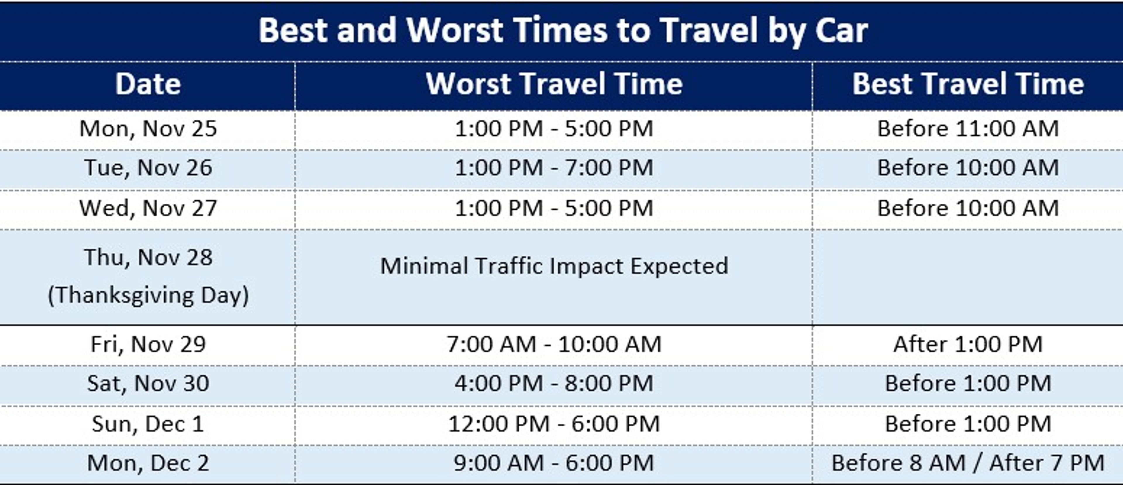 INRIX, a provider of transportation data and insights, says the worst times to travel by car over Thanksgiving are Tuesday and Wednesday afternoon. The best time to hit the road is Thanksgiving Day itself when interstates and highways are typically clear. Drivers returning home on Sunday should leave early in the morning, and those coming back on Monday should expect a mix of travelers and work commuters on the road.