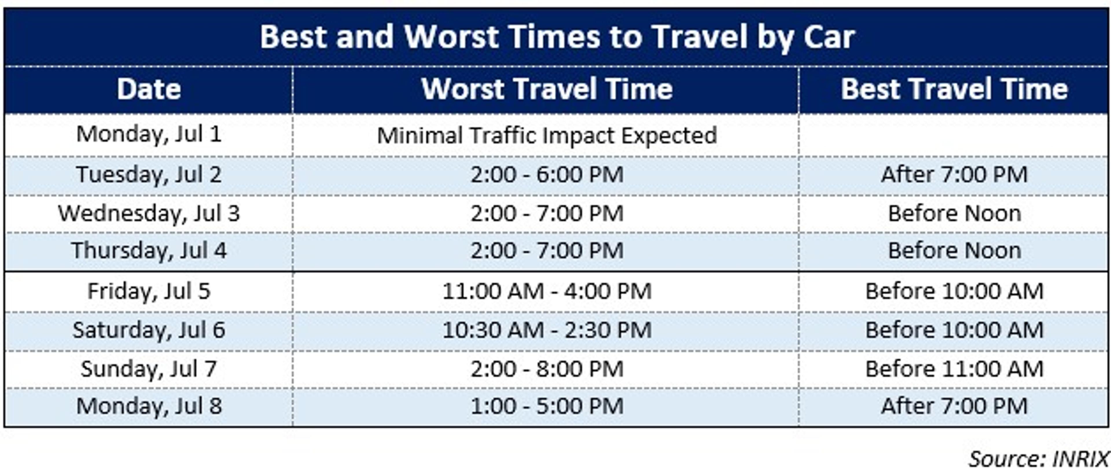 INRIX, a provider of transportation data and insights, says the worst times to travel by car before and on July 4th are between 2pm and 7pm. Drivers should hit the road in the morning, and travelers returning on Monday, July 8th should avoid rush hour traffic in the morning and afternoon.