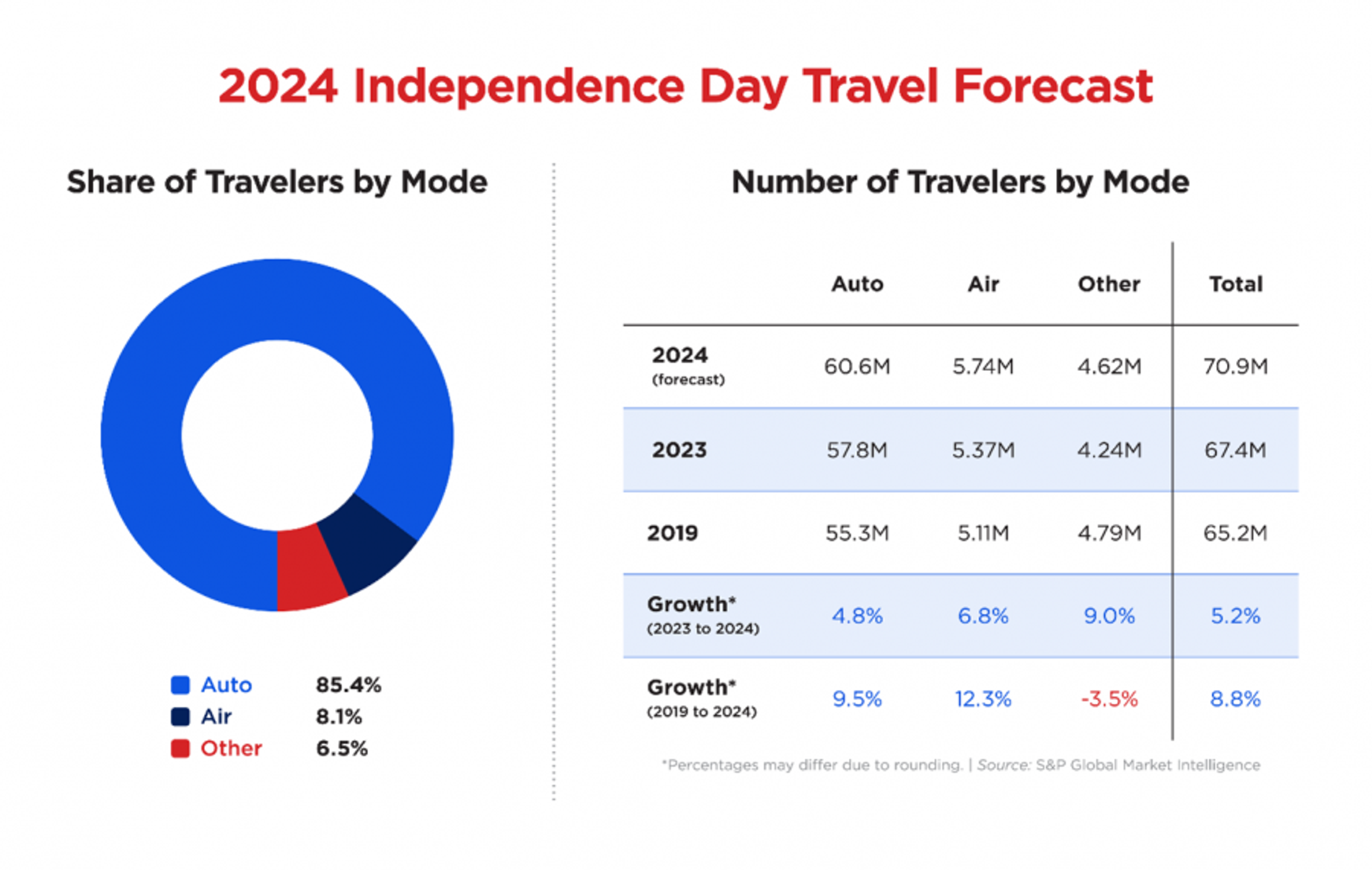 The travel forecast is reported in person-trips. In particular, AAA and SPGMI forecast the total U.S. holiday travel volume and expected mode of transportation. The travel forecast presented in this report was prepared the week of May 27, 2024.