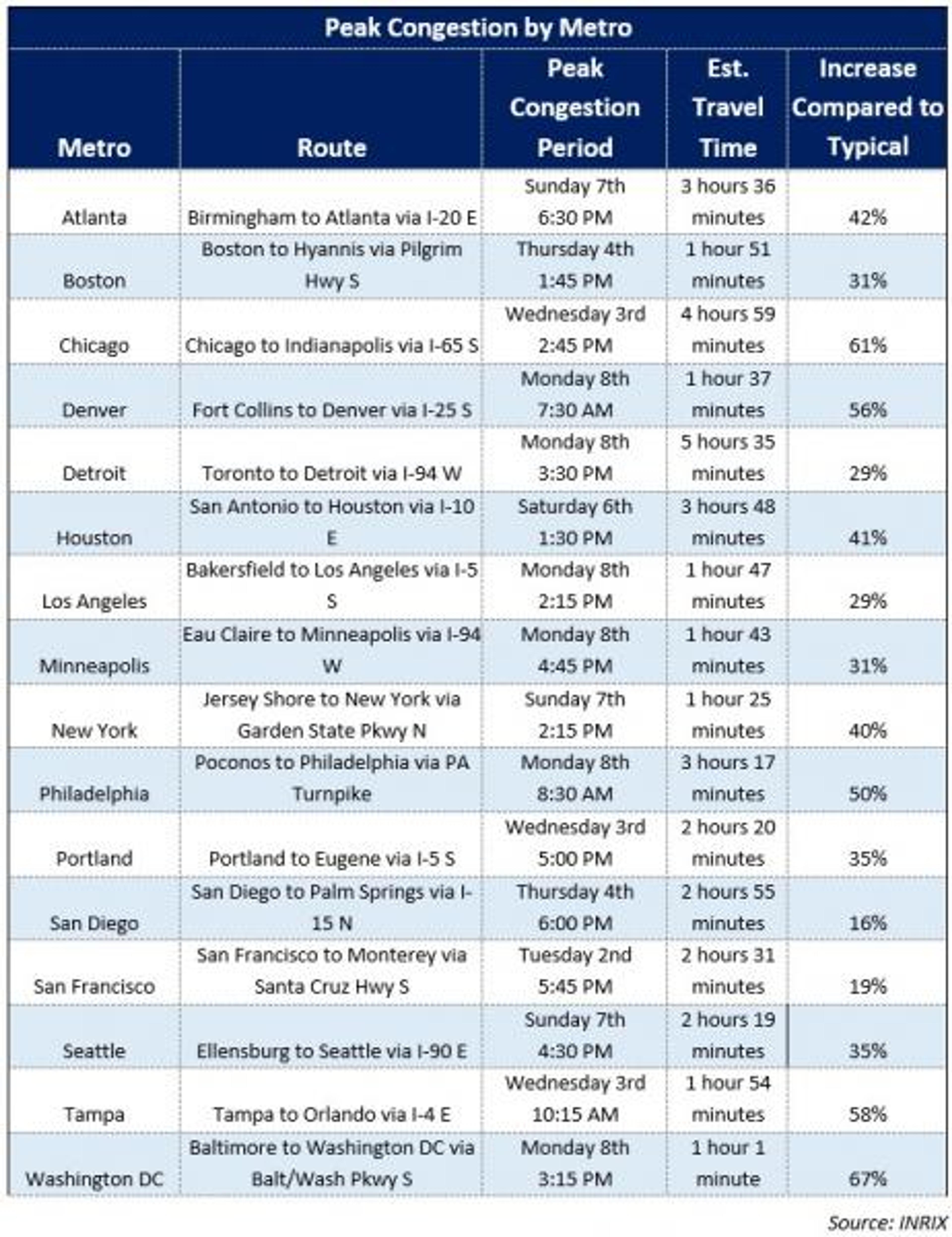 “Drivers in large metro areas can expect the worst traffic delays on Wednesday, July 3rd, as they leave town, and Sunday, July 7th, as they return,” said Bob Pishue, transportation analyst at INRIX. “Road trips over the holiday week could take up to 67% longer than normal. Travelers should monitor 511 services, local news stations, and traffic apps for up-to-the-minute road conditions.”