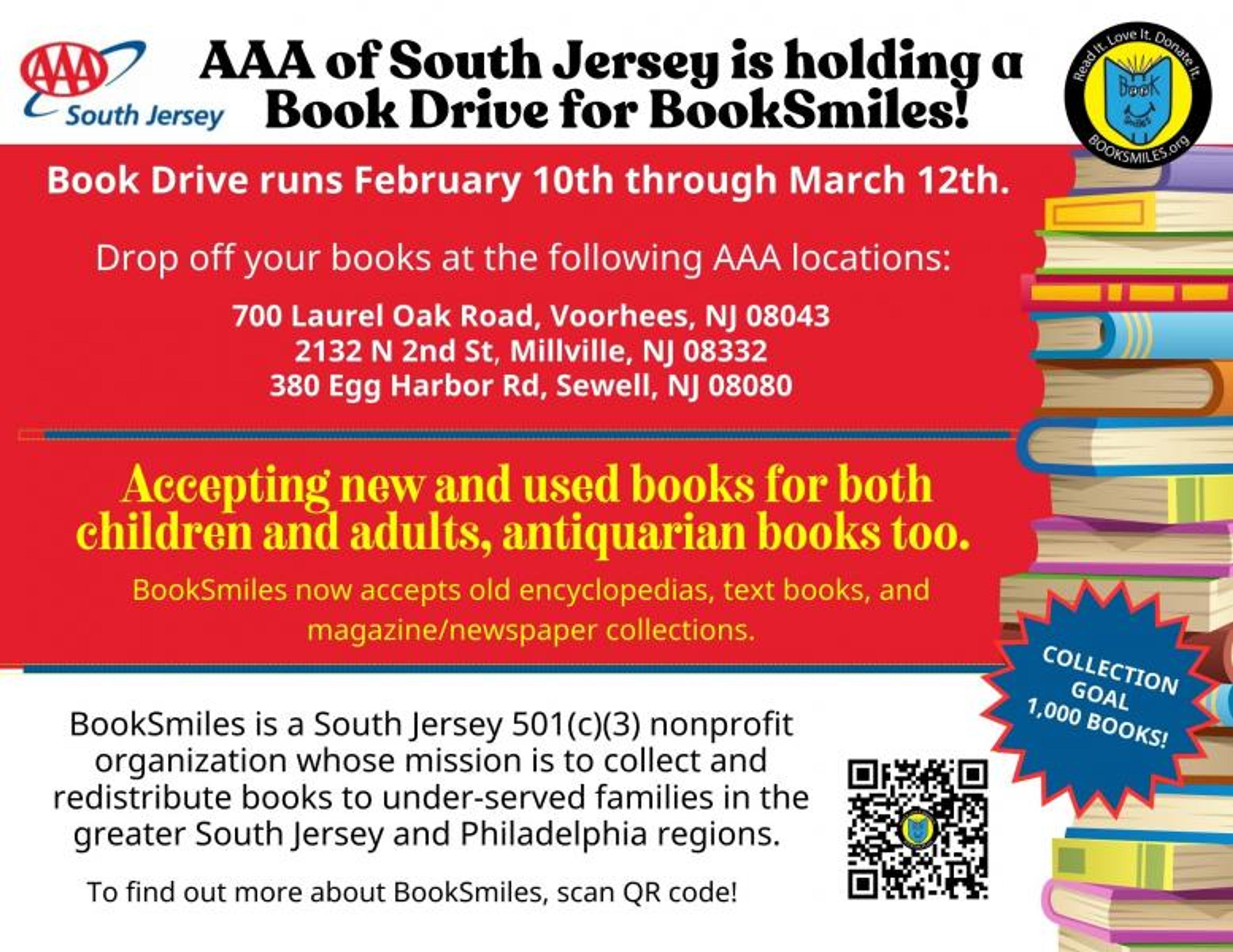 VOORHEES, N.J. (February 7, 2025) – AAA South Jersey is proud to partner with BookSmiles, a Pennsauken-based nonprofit, for a book drive in February. Members of the public are welcome to drop off new and used books at any of AAA South Jersey’s three locations now through Wednesday, March 12.