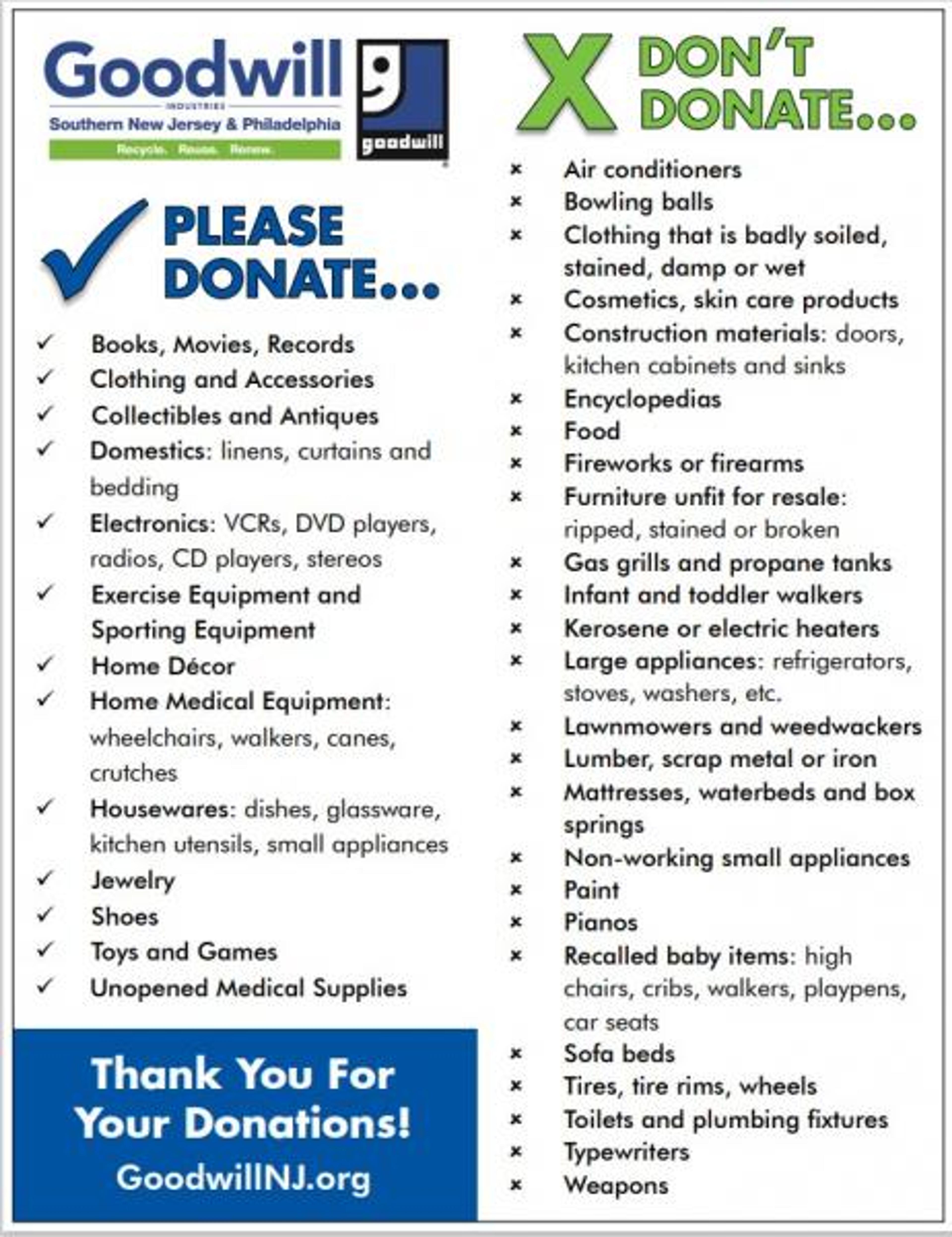 Goodwill is encouraging donations of clothing, accessories, shoes, toys, housewares, and more. Please see below for the full list of what can and cannot be donated.