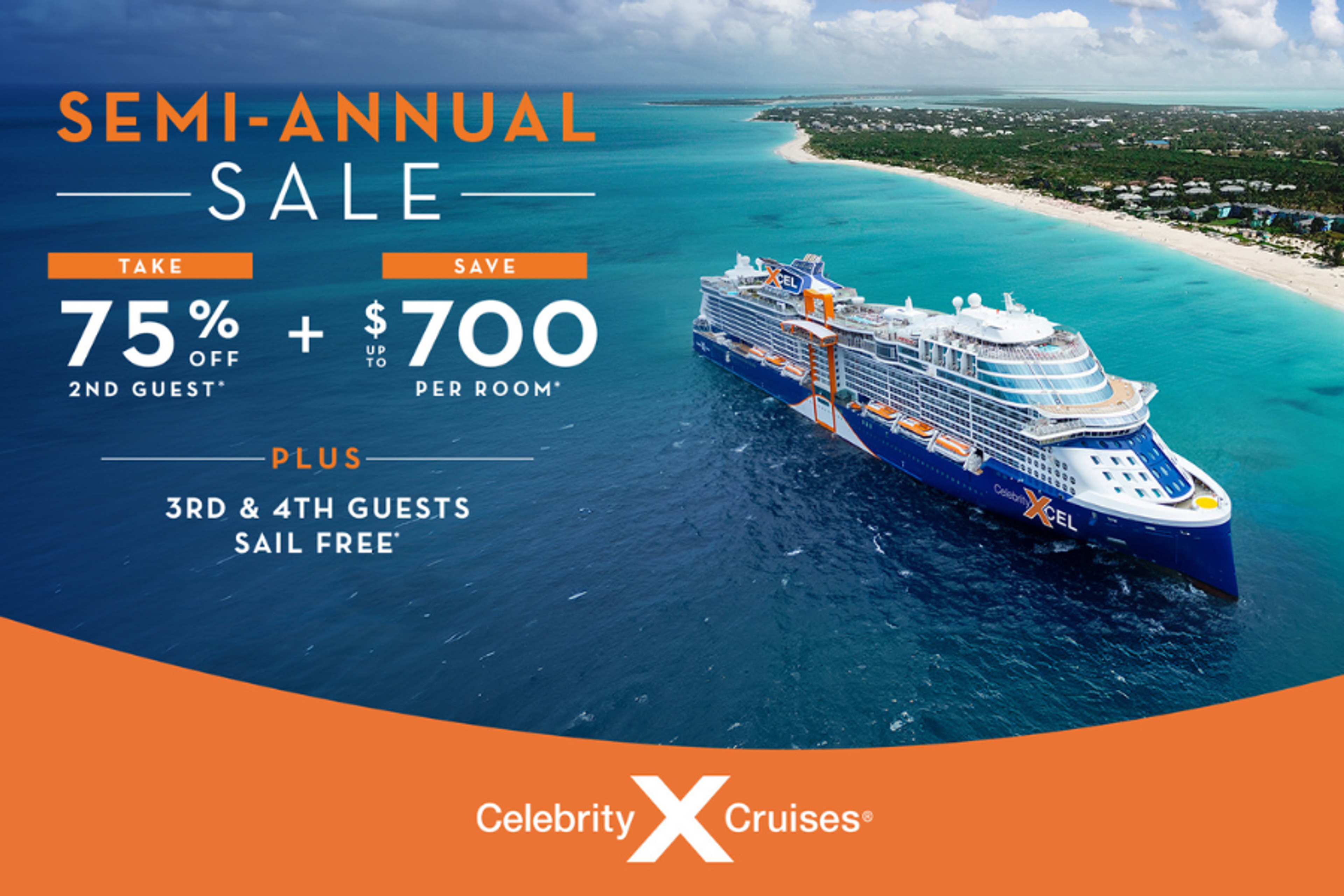 Take 75% off your second guest’s fare and get bonus savings on select dates. Plus, 3rd and 4th in your staterooms sail free on select sailings.*