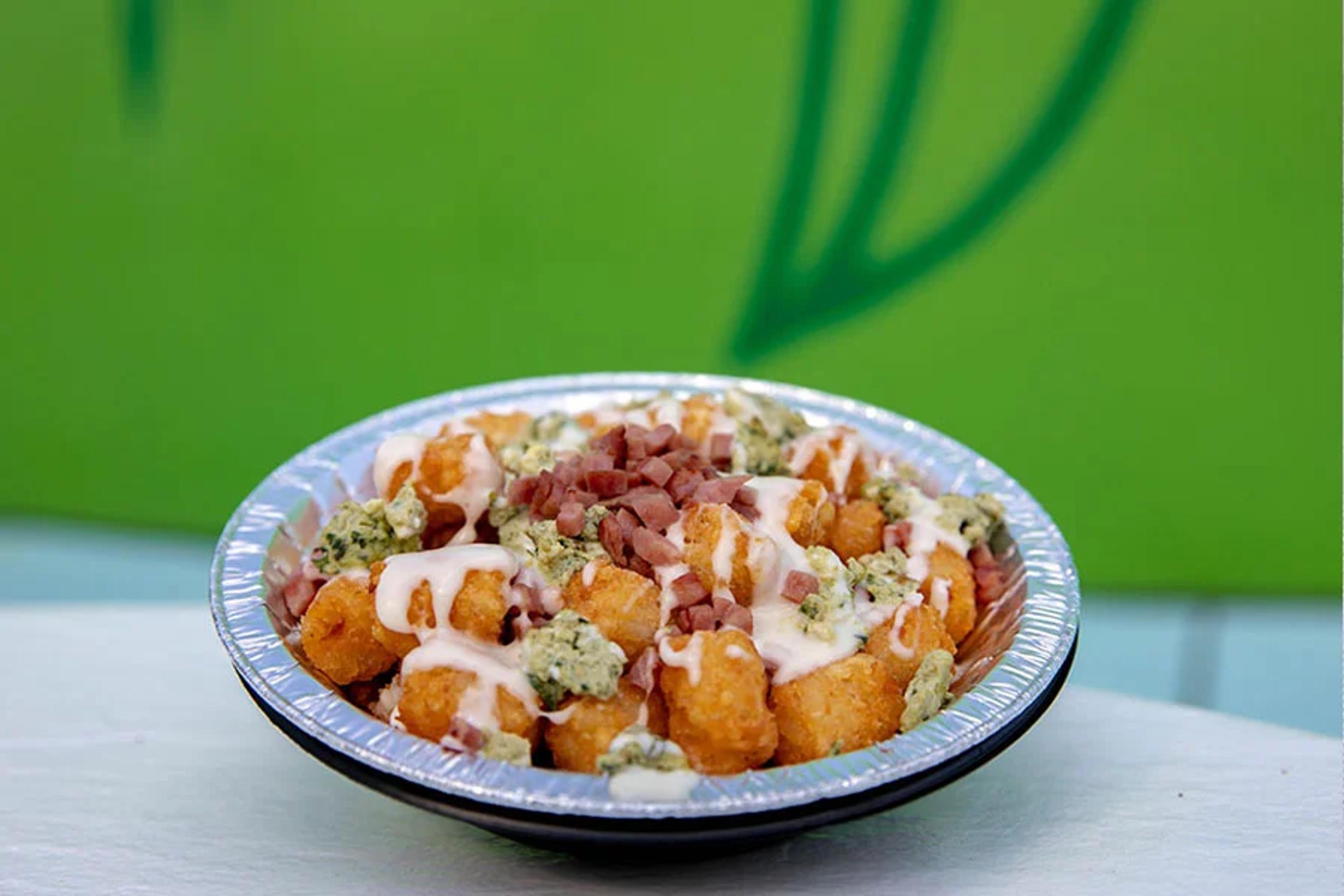 - Pull tots out of the oven and pour queso over the entire plate, ensuring proper coverage. Garnish with remaining ham.
